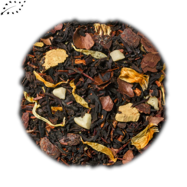 Schwarzer Tee* (55 %), Rooibos*, Kakaoschalen*, Süßholzwurzel*, natürliches Bittermandelaroma, natürliches Honigaroma, Steviablätter*, Mandeln gehackt*, Ringelblumenblütenblätter*
