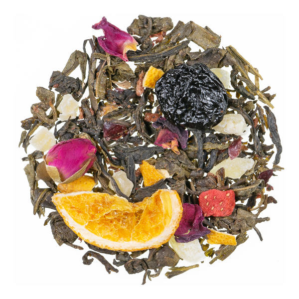 Weißer Tee mit Fruchtstücken und Blüten, aromatisiert